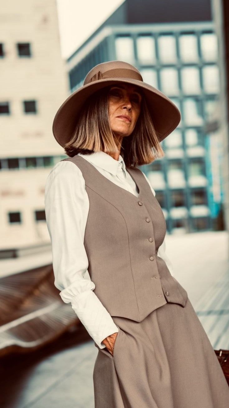 - Kamizelka z poprzednich sezonów w kolorze Taupe uszyta z mięsistej tkaniny