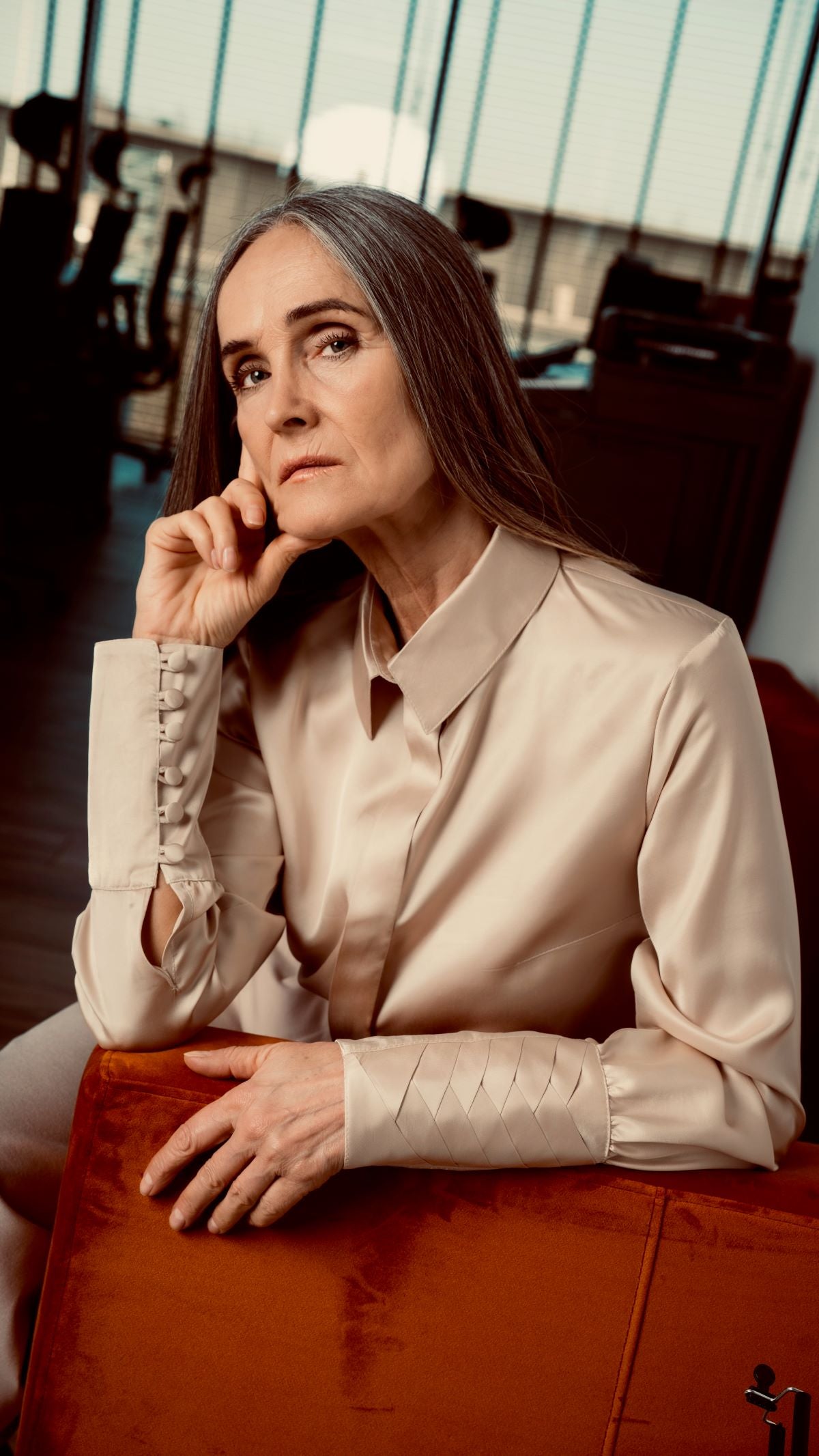 Ręcznie szyte, wysokie mankiety w jodełkę z obciąganymi guziczkami stanowią wyrazisty detal, który sam w sobie buduje stylizację – bez potrzeby dodatkowych akcesoriów.